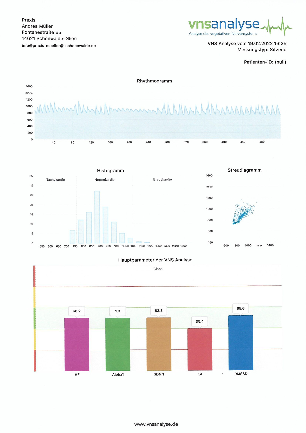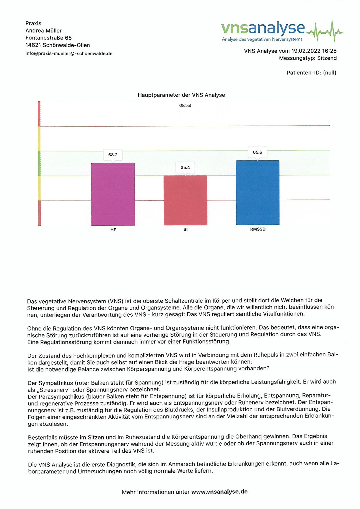 Diese Fragen lassen sich mithilfe der VNS-Analyse klären und anschaulich darstellen. Mögliche Störungen des vegetativen Nervensystems werden als Imbalance zwischen Anspannung und Entspannung sofort sichtbar gemacht. Es handelt sich um eine schmerz- und nebenwirkungsfreie Messung, welche mittels eines Brustgurtes in einer 10-minütigen Sitzung durchgeführt wird.